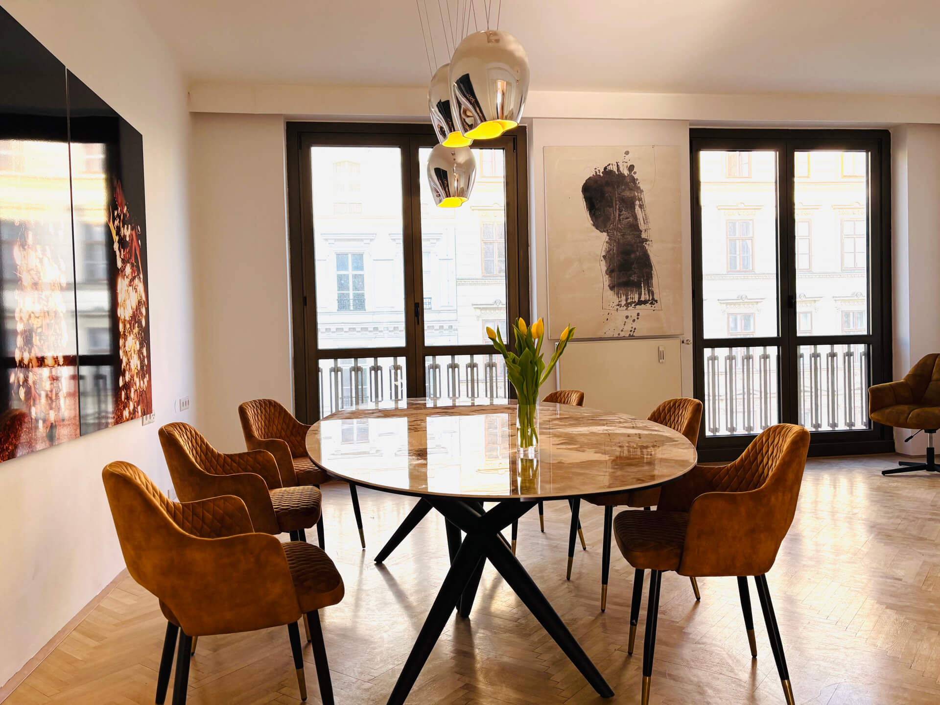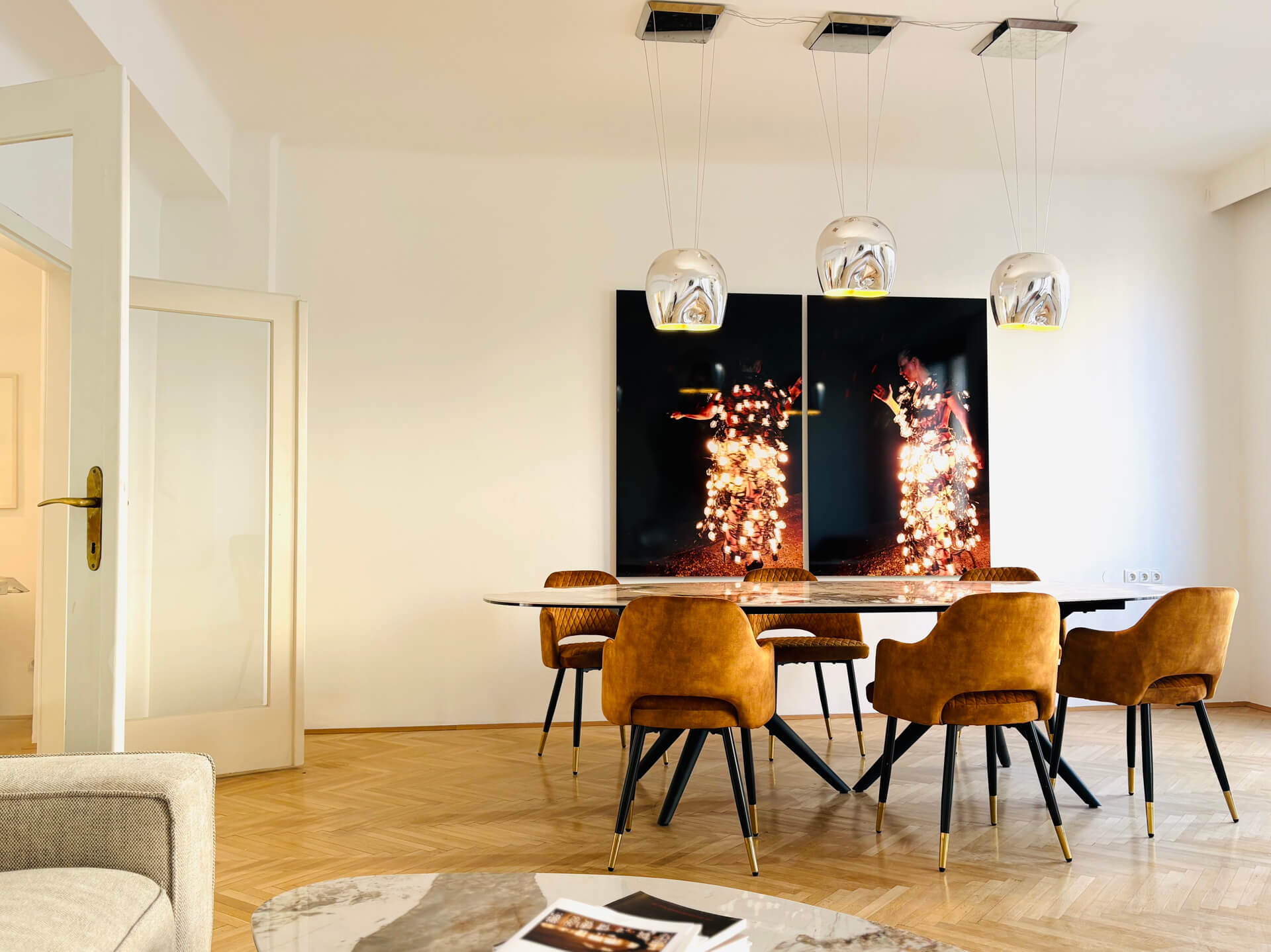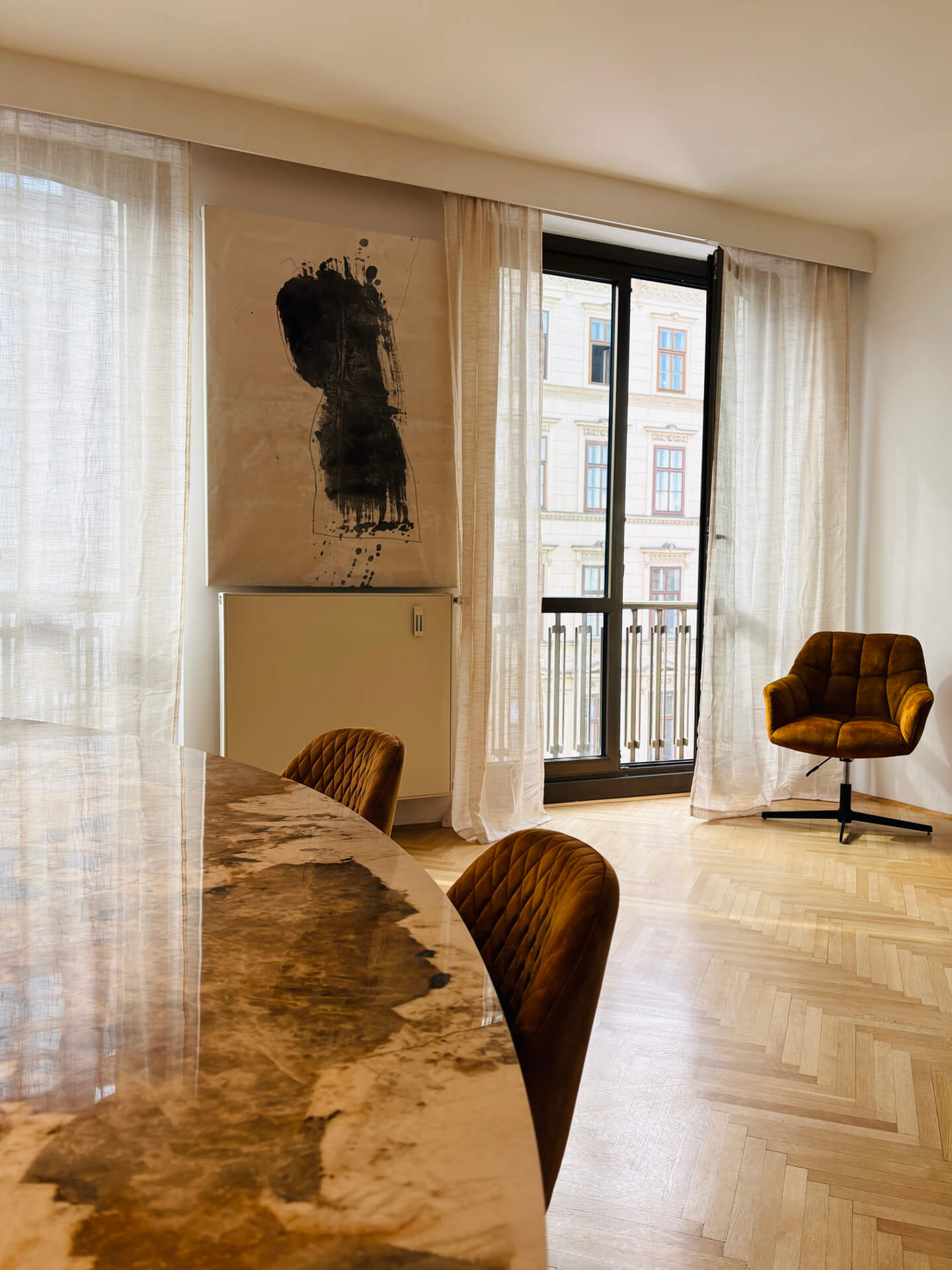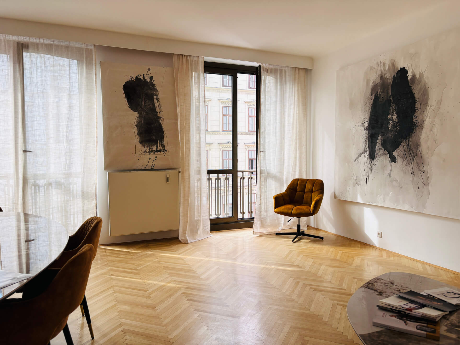 Schon beim Betreten empfängt Sie ein großzügiger Vorraum, der Sie wie ein stiller Concierge willkommen heißt. Von hier aus entfaltet sich die Wohnung in hellem Glanz: Ein sonnendurchflutetes Wohnzimmer, das Platz für Sonntagsfrühstücke, Lieblingsbücher und lange Gespräche bietet. Das angrenzende Verbindungszimmer lädt geradezu ein, der neue Lieblingsplatz für gemütliche Abendessen oder kreative Ideen zu werden.